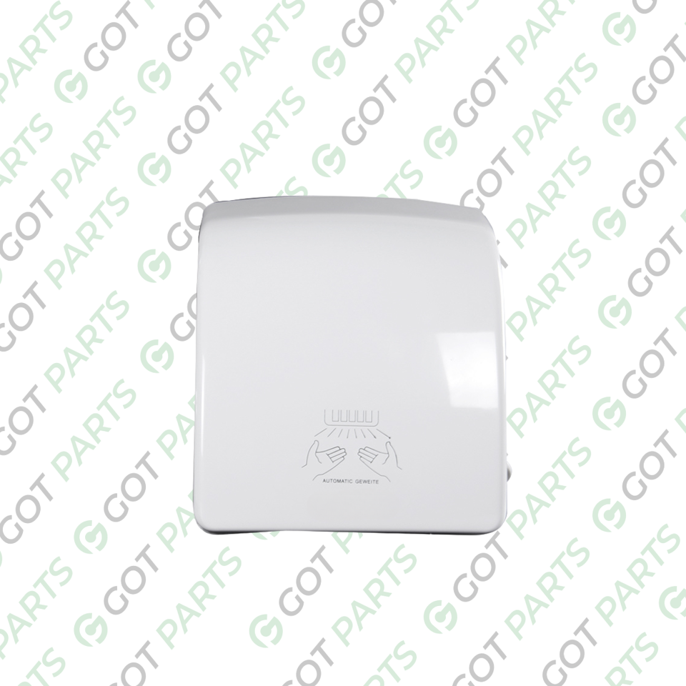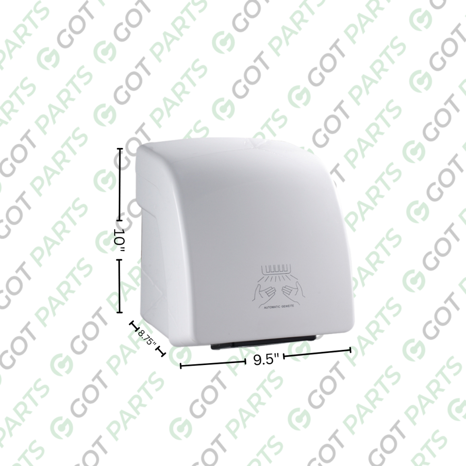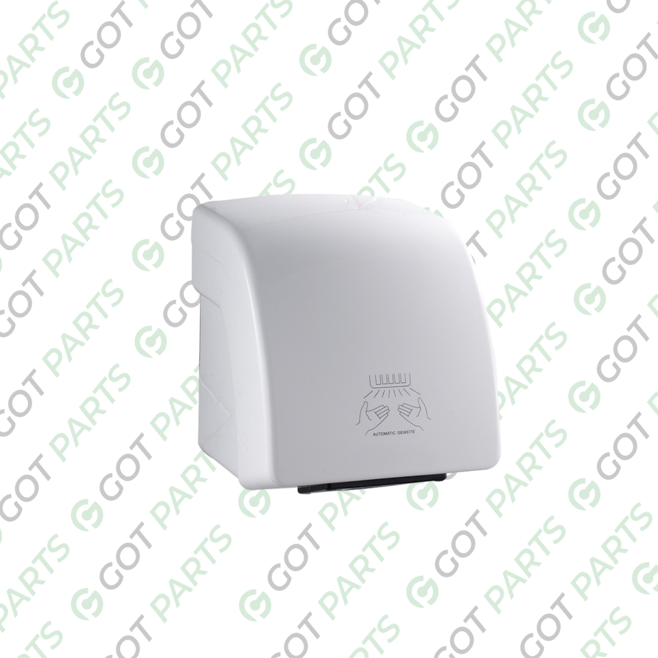 Classic white ABS plastic hand dryer. This accessory automatically shuts off after use to conserve energy. It has a compact size, ideal for both home and business use.