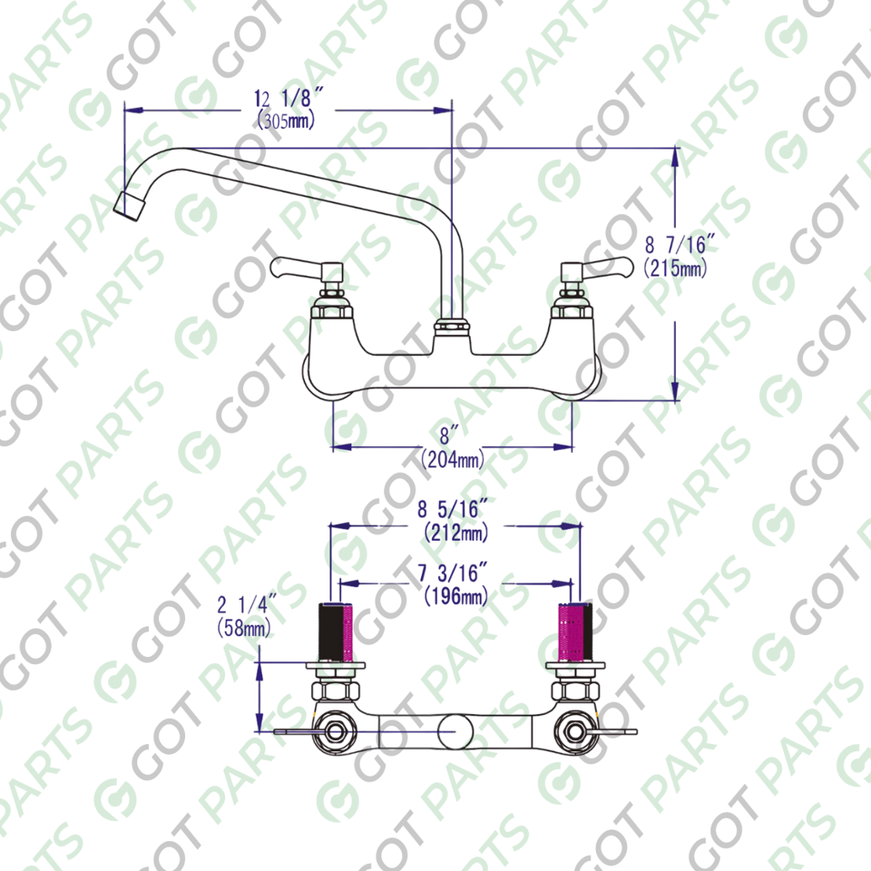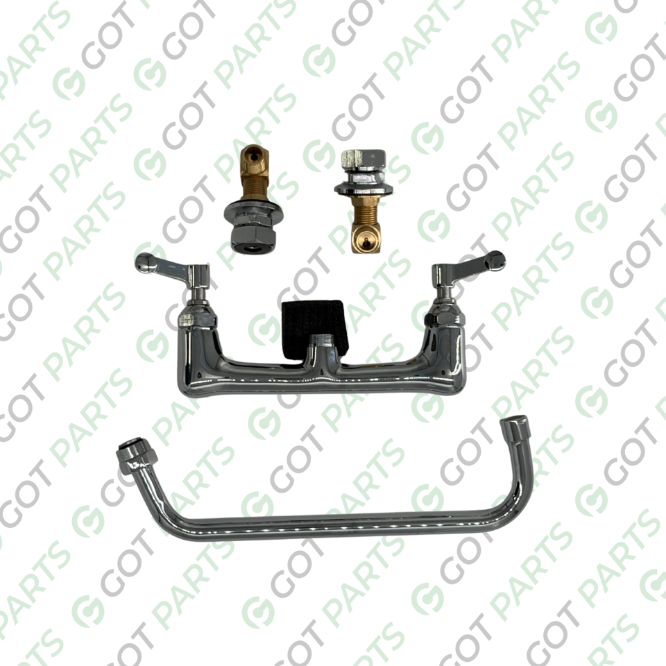 Brass Chrome Base Two Hole Wall Mount Kitchen Faucet, Stainless Steel 8” Spout with Metal Lever Handles.