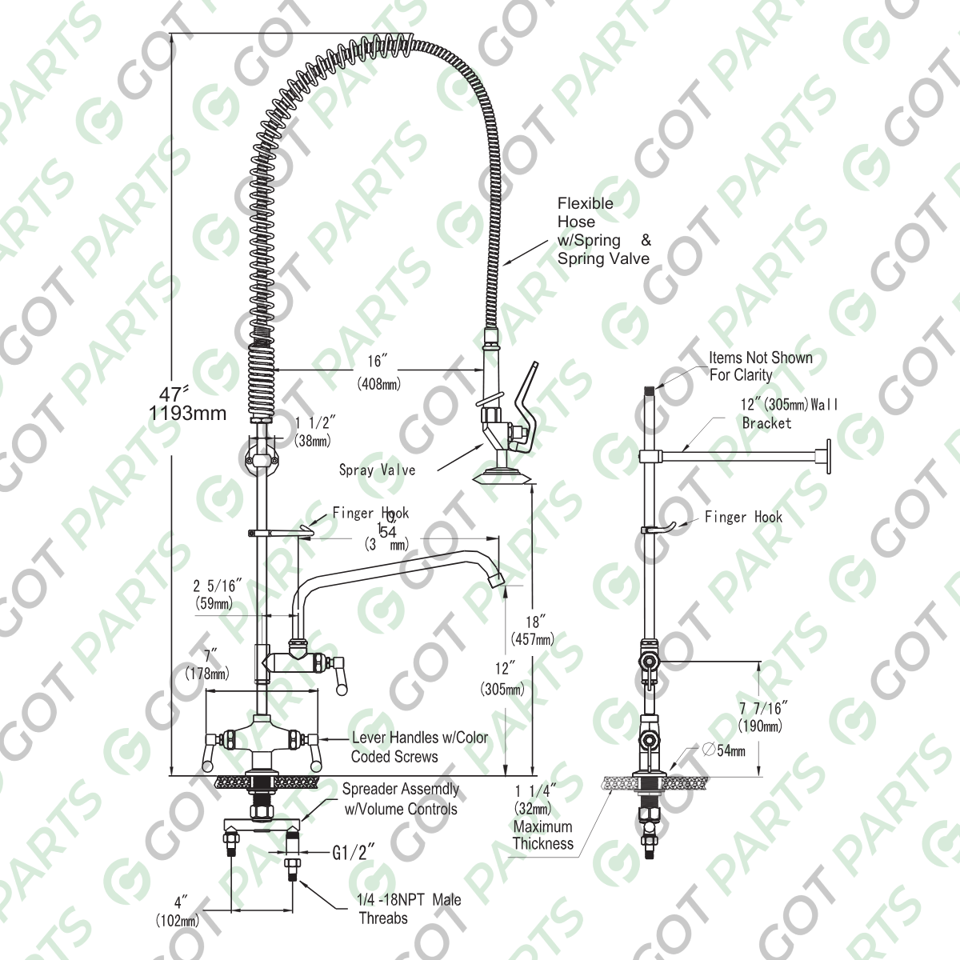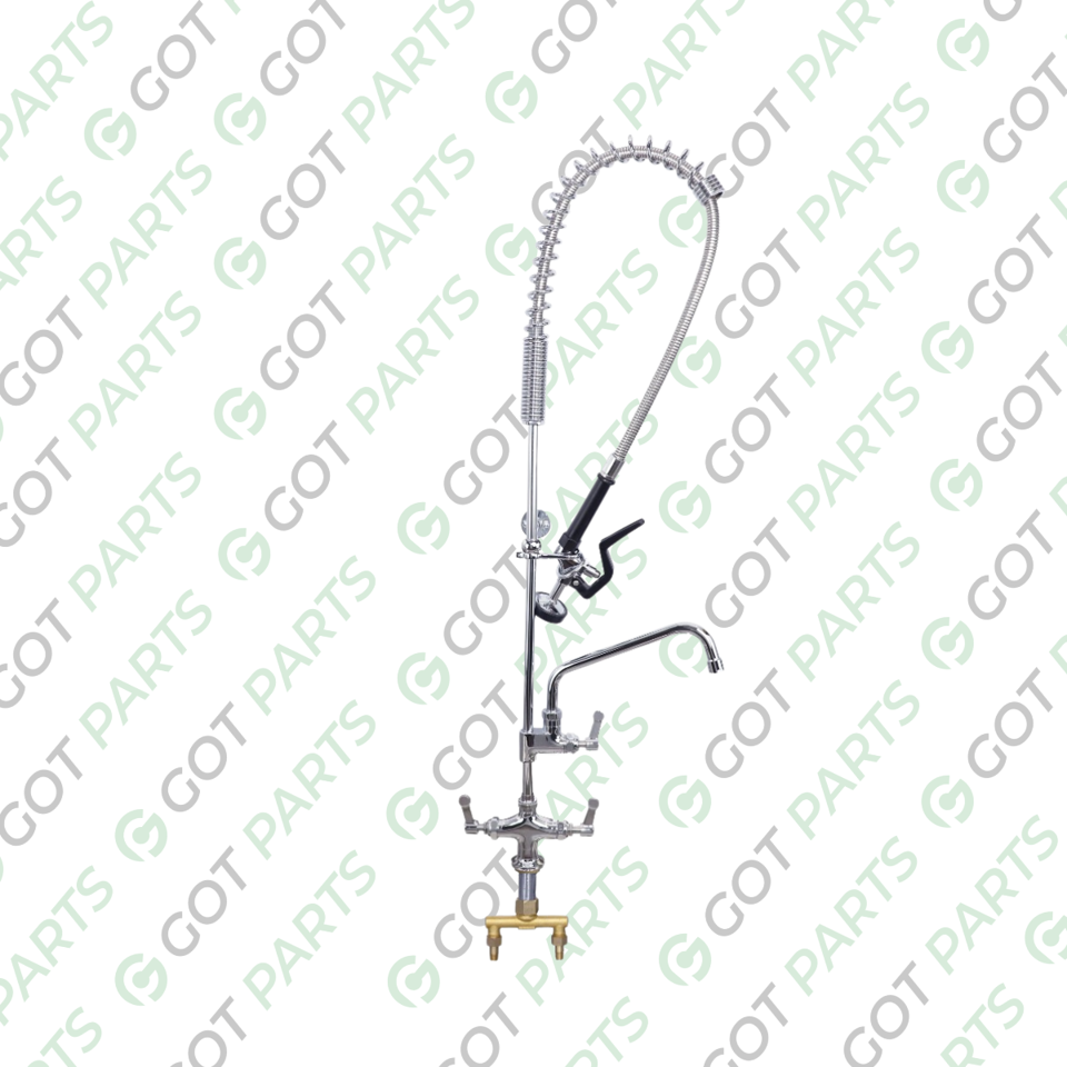 Brass Chrome Base Two Hole Deck Mount Pre-Rinse Faucet, Stainless Steel 10” Spout, 47” Height.